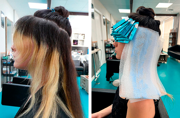 -Aísla la zona superior (corona y triángulo frontal) para aplicar posteriormente el tono negro. - Decoloración