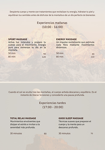 El primer análisis fue sencillo, pero determinante. El comportamiento del huésped no es el mismo por la mañana que por la tarde. Tampoco lo son sus necesidades físicas ni su disponibilidad de tiempo. Por la mañana, el cuerpo está preparado para activarse y el cliente puede elegir tratamientos más largos porque tiene más margen. Por la tarde, especialmente tras una jornada intensa en la montaña, la demanda se concentra y el cuerpo pide recuperación y calma.