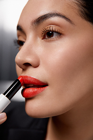 El foco de atención en esta propuesta son los labios: muy hidratados, elásticos y sensuales. La maquilladora ha definido muy bien la forma de los labios, dándoles volumen y presencia aplicando tonos vibrantes. “He elegido un rojo intenso -puntualiza- de acabado coral, aterciopelado”.
