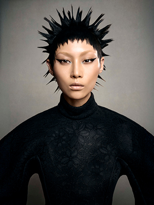 La colección muestra macropeinados escultóricos como un bouffant o cardado en la coronilla, un tupé super texturizado en la zona frontal y una melena larga castaña con estructura tipo colmena y tocado geométrico. También vemos cortes de precisión y muy despuntados en estilos comerciales como el Bowl cut (corte tazón) y el Hime Cut (corte japonés que combina melena larga con dos mechones frontales rectos a la altura de las mejillas). Espectacular también el tocado trenzado que luce una de las modelos. En resumen, toques de vanguardia para una colección que ha catapultado a Davies.